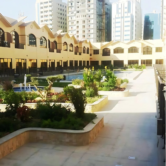 townhouse compound in al barsha 1, Dubai with amenities including a fitness center, and an outdoor pool.